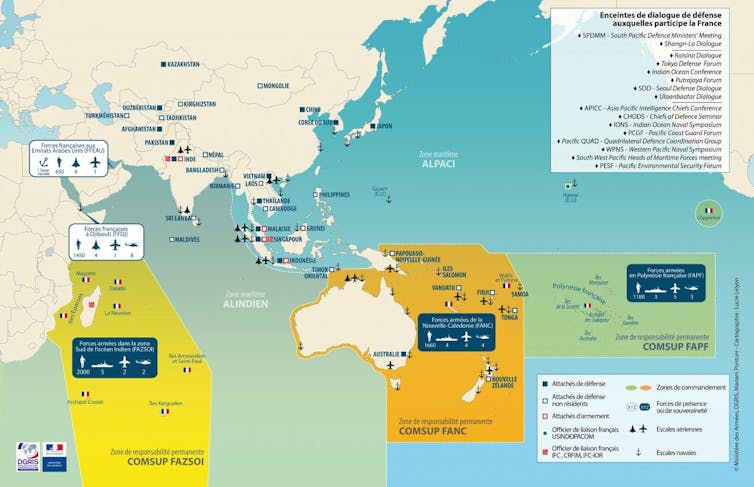 La France est en effet un pays riverain de l’Indo-Pacifique et possède des intérêts stratégiques à défendre du fait de sa présence dans les bassins indien et océanien de la région. Elle y dispose d’une vaste Zone économique exclusive (ZEE) à contrôler et est elle-même confrontée à des menaces – trafics, pêche illégale, atteintes à la biodiversité, changement climatique – qui affectent ses voisins insulaires dans le sud de l’océan Indien et l’Océanie. Les opérations d’influence et la politique d’investissements chinoises dans l’ensemble du Pacifique préoccupent autant Paris que Canberra et Washington.