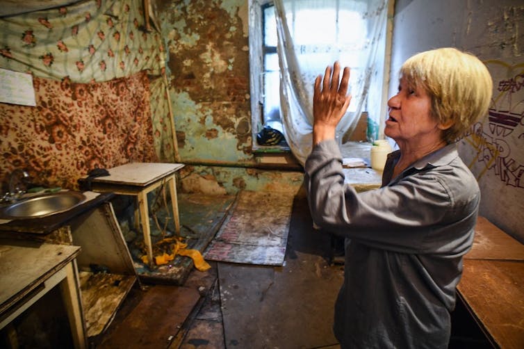 Zinaida Ibragimova, 69 ans, fait visiter la cuisine commune dans un dortoir pour les ouvriers de l’usine textile Proletarka dans la ville de Tver, à 200 kilomètres au nord-ouest de Moscou, le 8 août 2020. 11 % des Russes vivent sous le seuil de pauvreté, selon les statistiques officielles, mais d’après de nombreux observateurs, ce seuil est établi à un niveau délibérément très bas. Alexander Nemenov/AFP