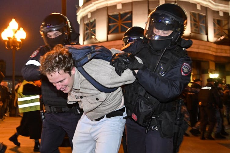Plus de mille personnes ont été arrêtées pour avoir protesté contre la « mobilisation partielle » décrétée par Vladimir Poutine le 21 septembre. Ici, Moscou, le 21 septembre au soir. Alexander Nemenov/AFP