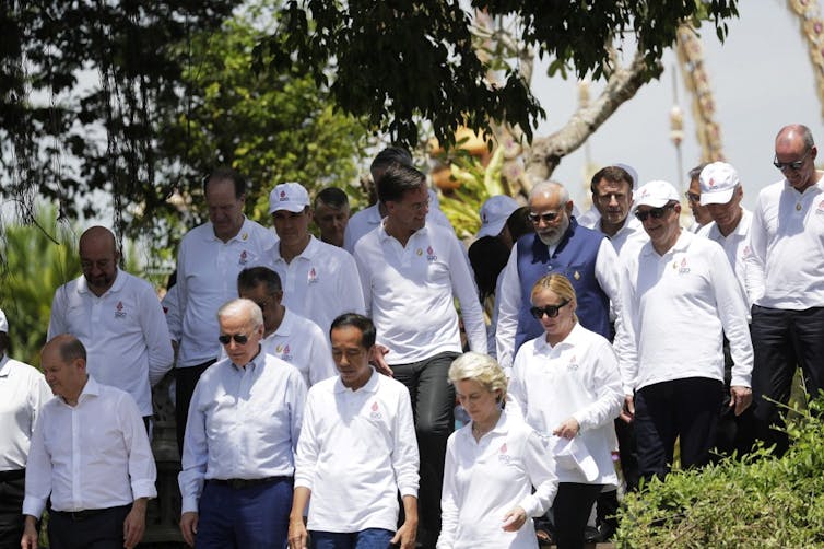 Les dirigeants des pays du G20 dans le parc forestier de mangrove Tahura Ngurah Rai à Bali, le 16 novembre 2022. Mast Irham/AFP